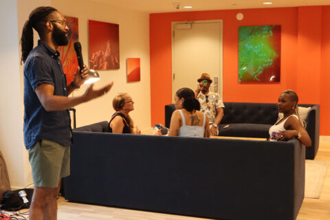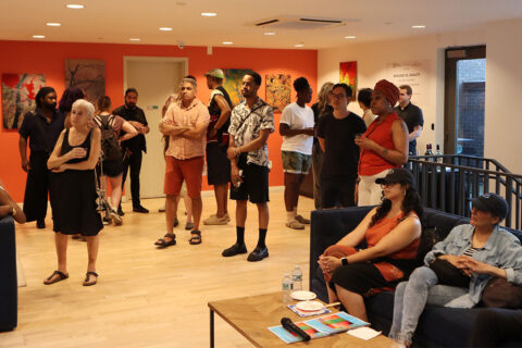 The conversation, moderated by Justin Freeman, was intimate and engaging, with audience members asking about Laziza’s process, inspirations, and her journey as an immigrant artist in New York City. The crowd reflected the diversity of our city, and connections formed effortlessly—helped along by warm bites, cool drinks, and shared curiosity.